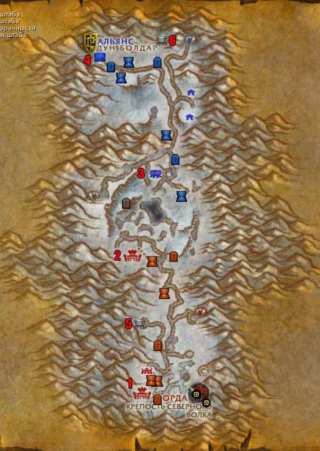 Орда стартует в точке 1. К руднику 2 уходит один-два человека чтобы занять его. В точке 3 уходит одна группа чтобы задержать альянс у кэпа Гальвангара, эта же группа потом не мешает сжеч башни и вообще всячески выиграть время. Все остальные дружно следуют вперед не отвлекаясь на проходящую рядом колону игроков Альянса. По ходу по пару человек уходят на башни. В точке 4 по быстрому зергаете Белинду все вместе. Далее все продвигаются к генералу. Кладбище 5 не занимается! Один человек может сбегать чекнуть рудник 6. Далее главная задача - занять кладбище у генерала. Потом чекаются ближние башни и все дэфят кладбище и башни, пока те не сгорят. Генерал остается с 0-1 маршалов. К тому моменту нужно определиться с танками и хилами, после чего быстро зерг.